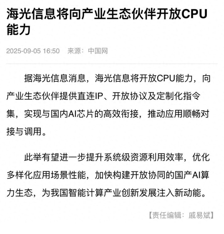 海光信息宣布开放其CPU接口和指令集配资方式,支持国内AI芯片企业进行深度适配与协同创新!