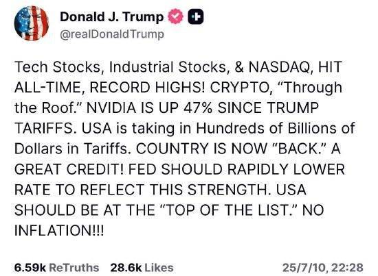 科技股、工业股和纳斯达克指数创历史新高!加密货币“飙升至天际”。自特朗普关税征收以来,英伟达股价上涨了47%。美国通过关税收入数千亿美元。国家现在“重回正轨”。这是一项巨大的功绩!美联储应该迅速降息,以反映当前的强劲表现。没有通胀!!!