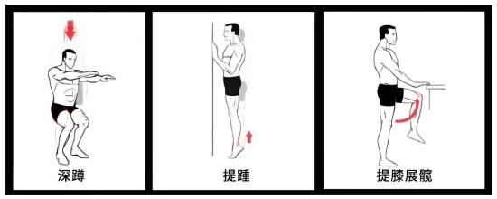 提膝展髋:站立膝盖抬高,直腿髋关节伸展。